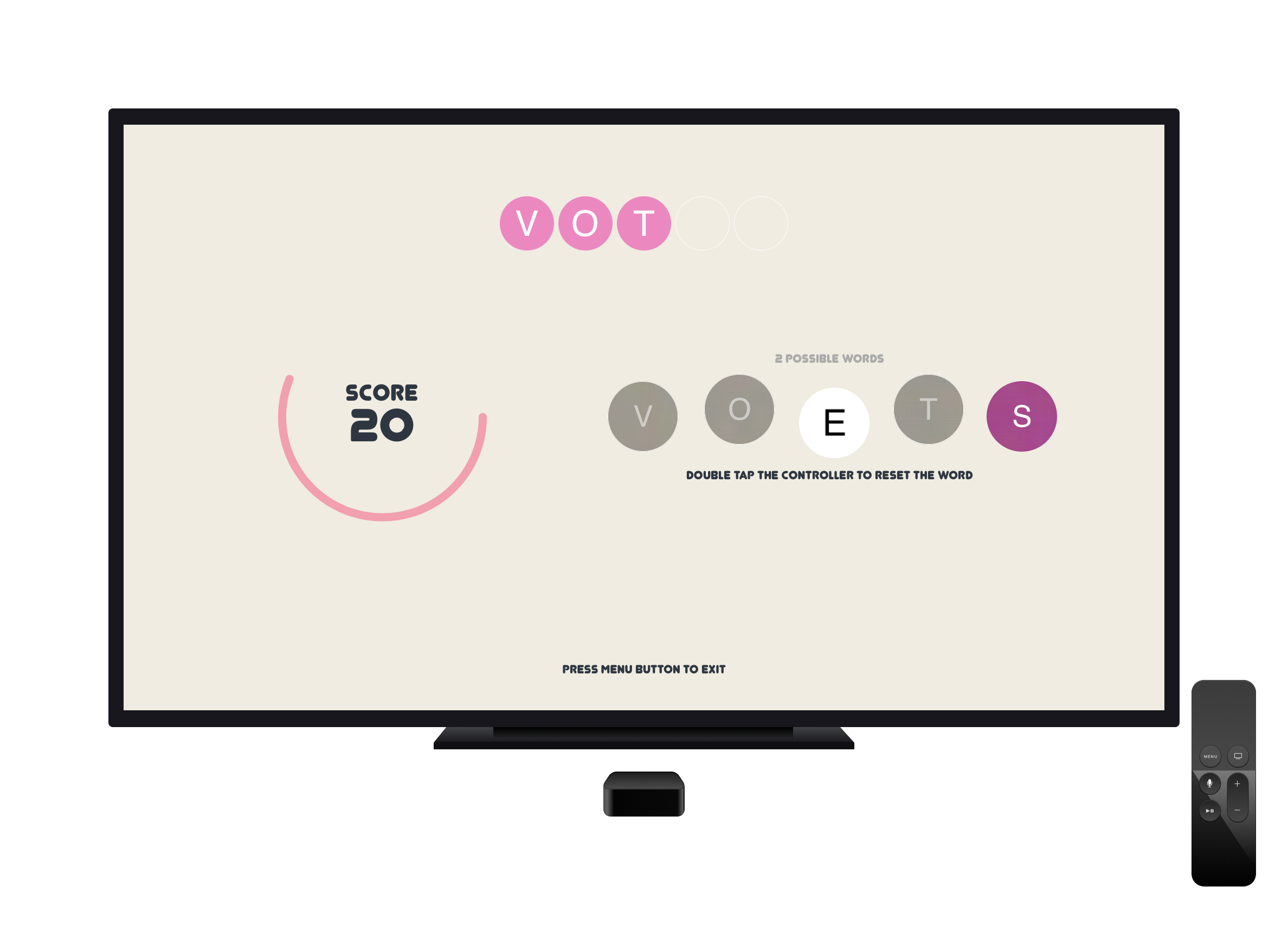 "FIVVY WORDS" is an amazing funny and simple letter puzzle app for your Apple TV! It's a game which challenges your mental abilities to arrange the letter salad. "FIVVY WORDS" letter puzzle is optimized for fast and lateral thinker... Prove yourself as a living encyclopedia and with already supported game center implementation challenge yourself with the rest of the world!